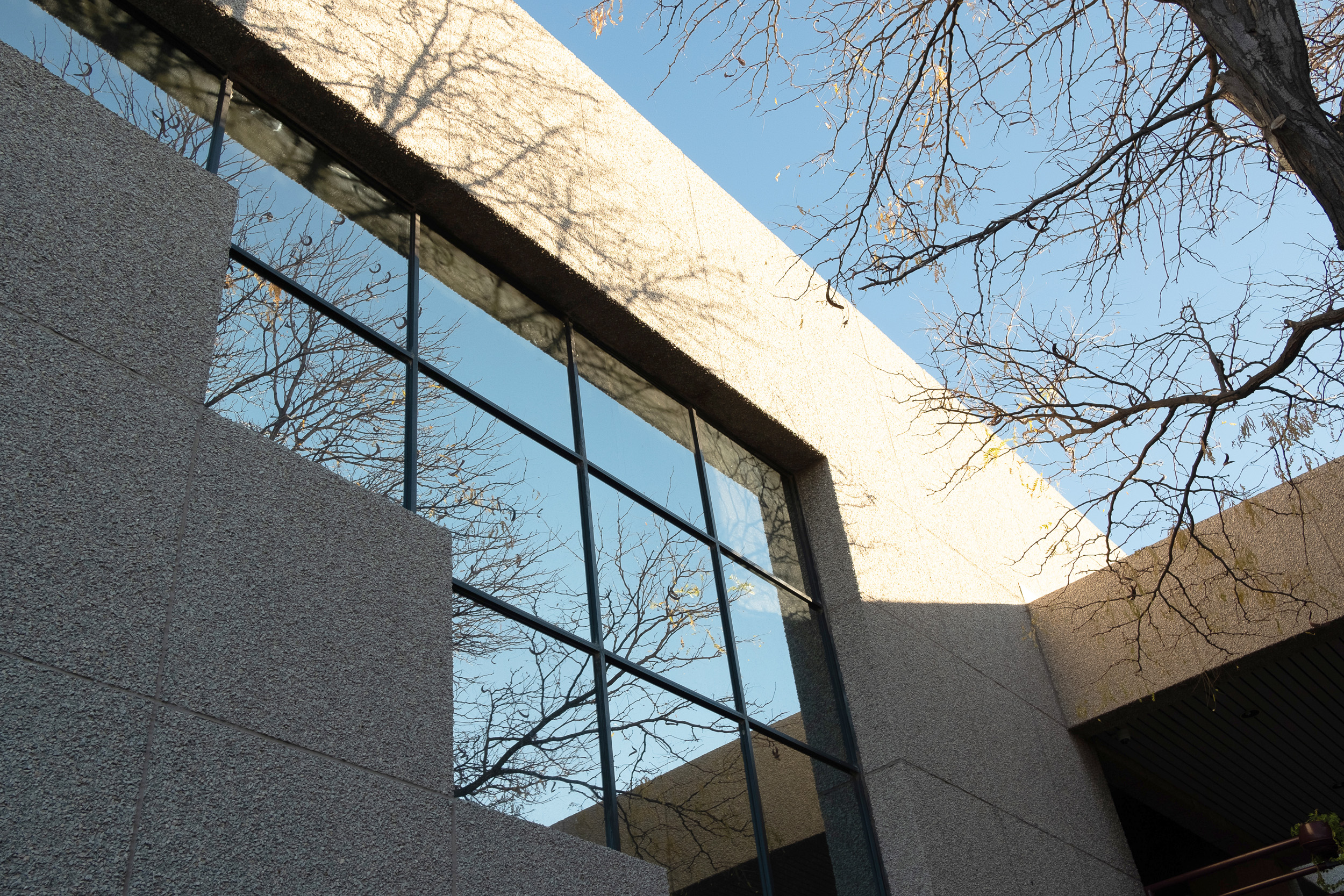 El edificio de dos niveles está construído en estructura de acero y muros prefabricados con acabado exterior de piedra natural en tonos de gris.